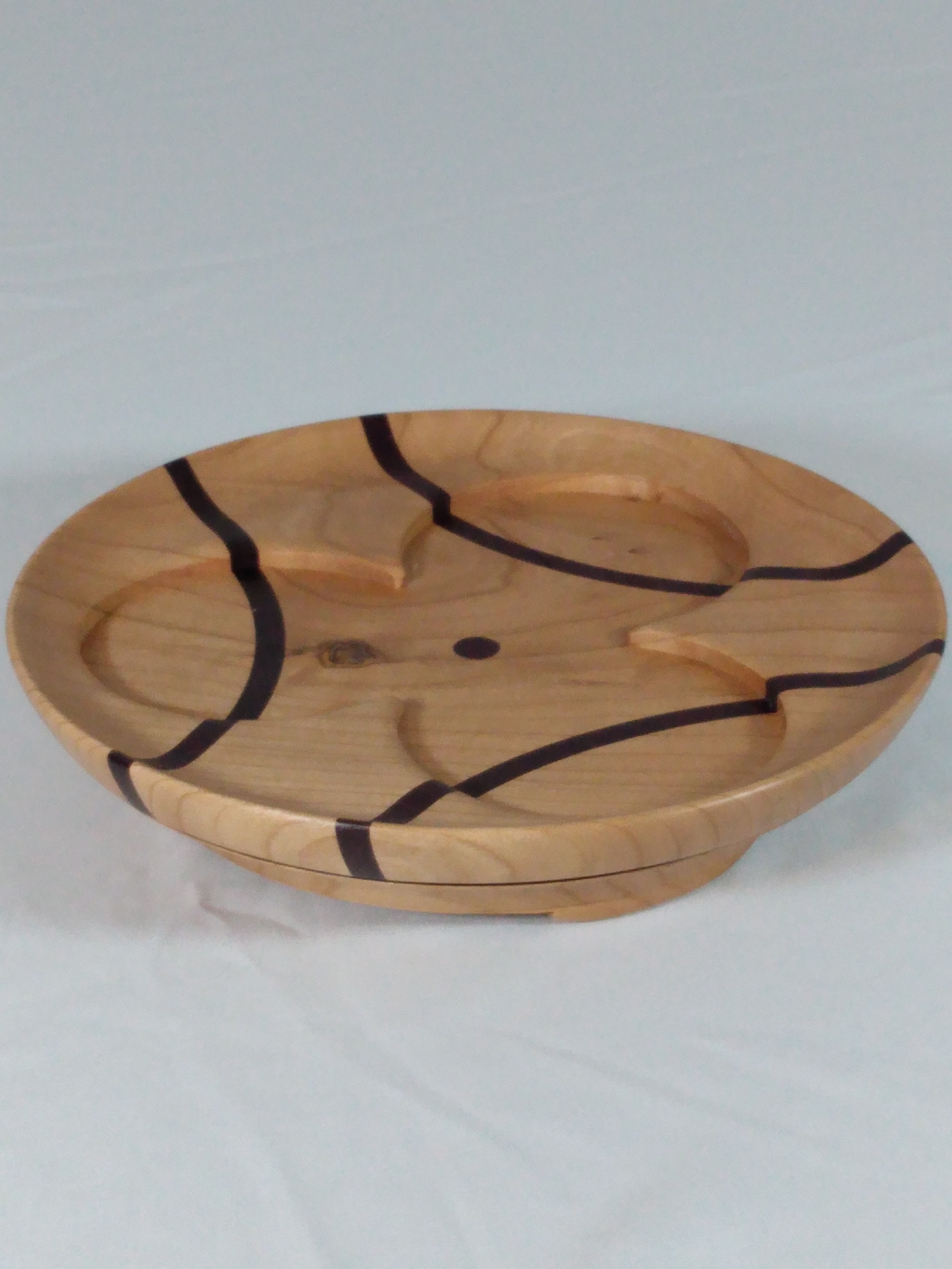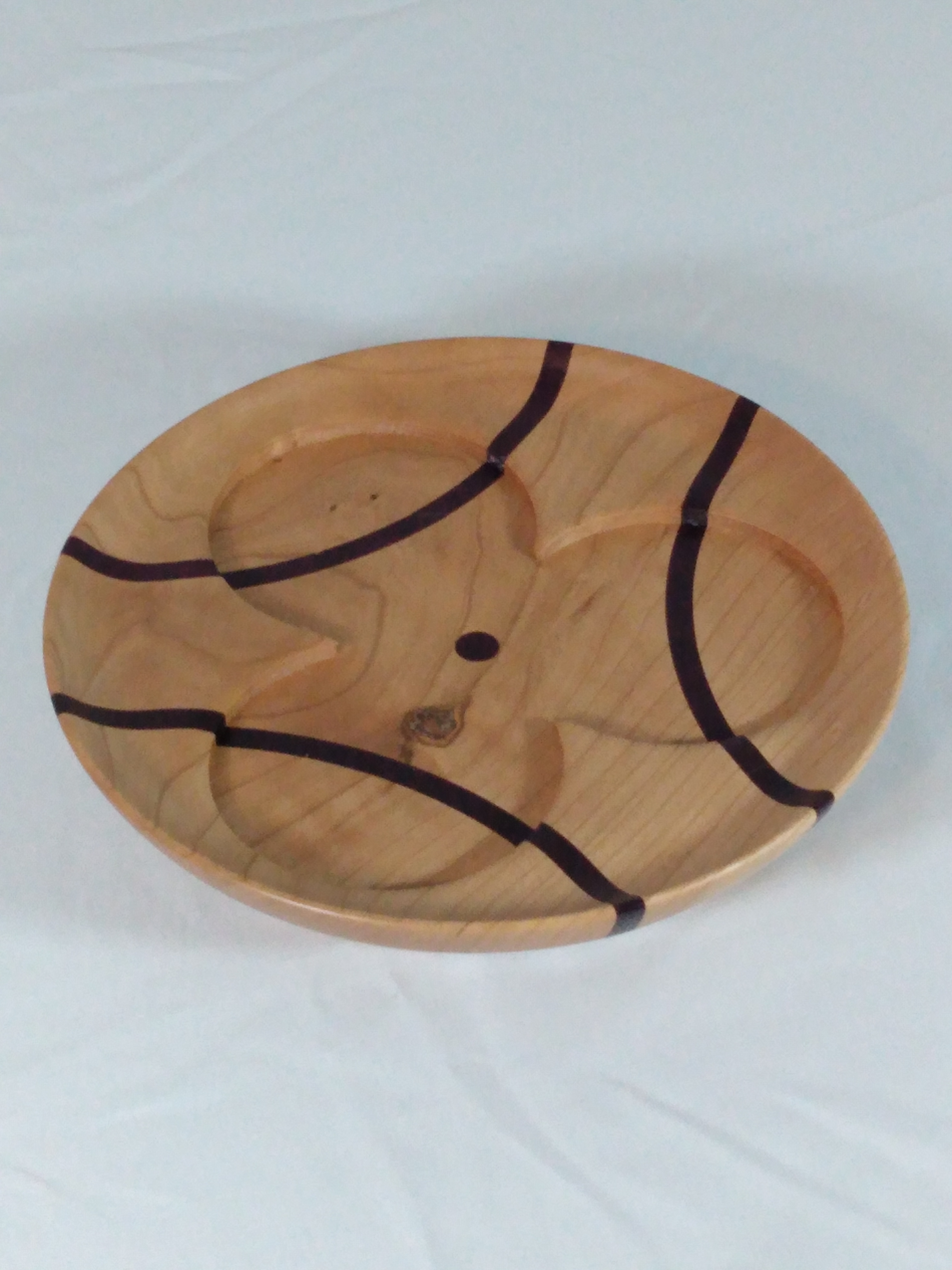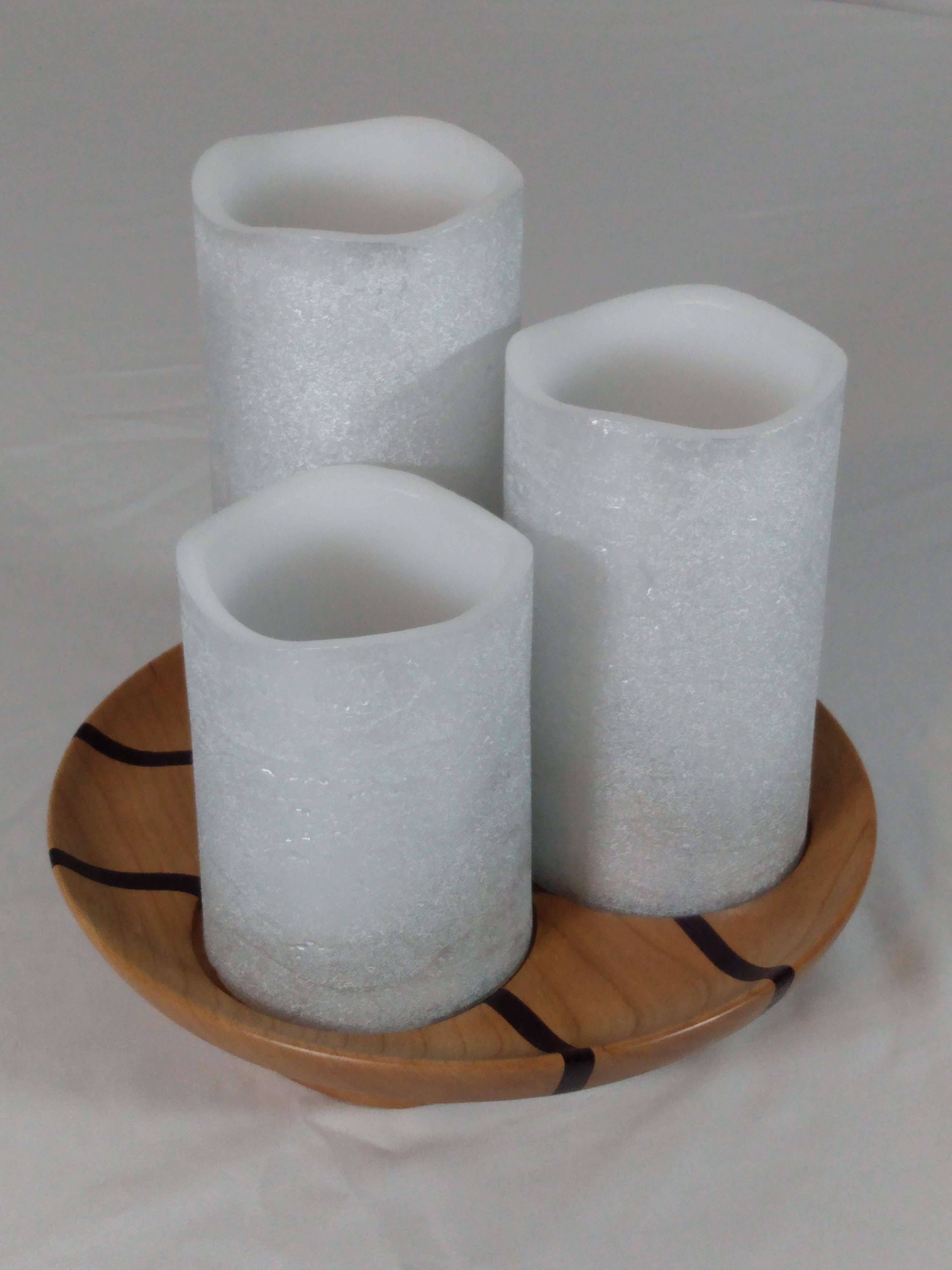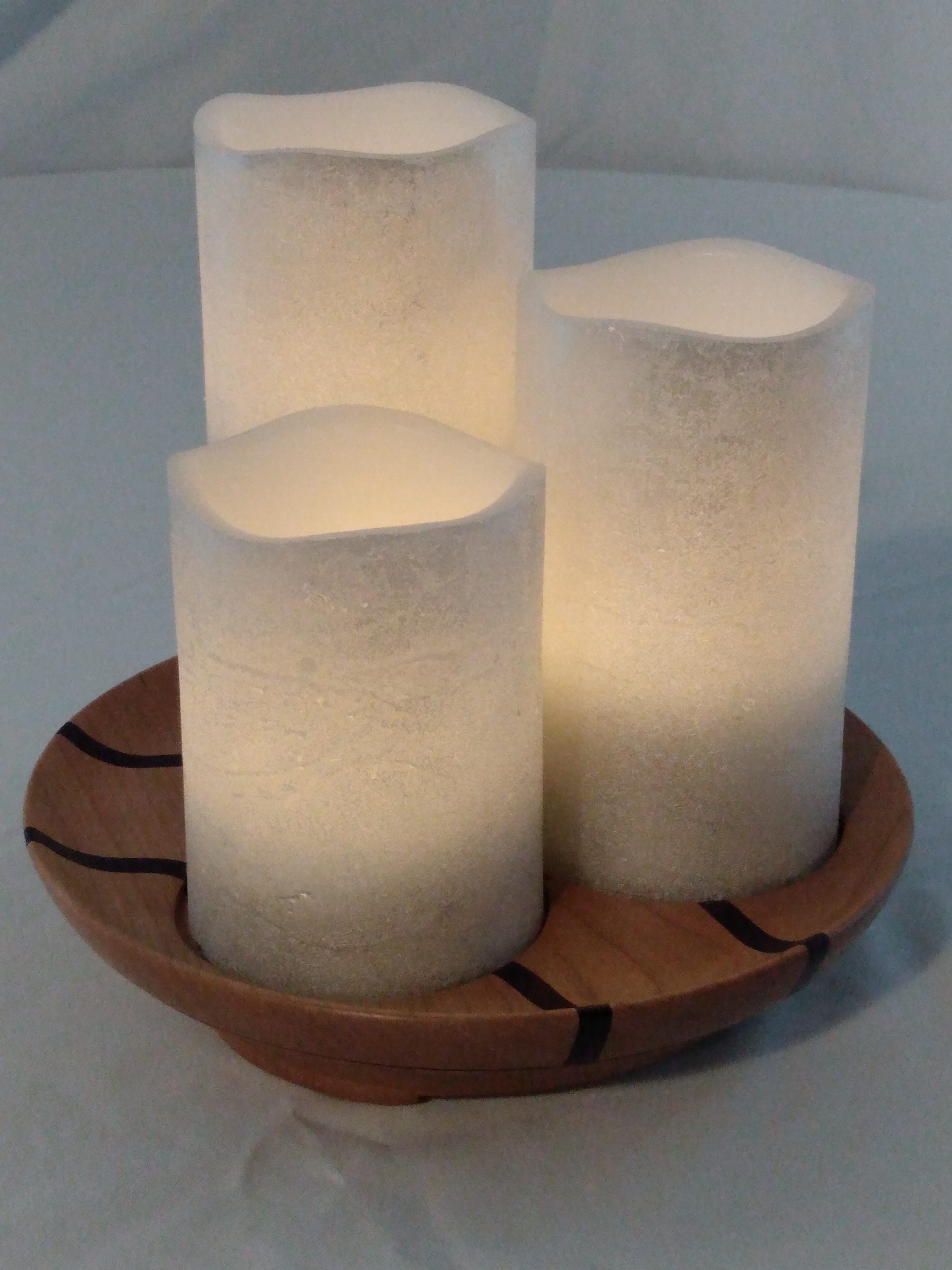 Tri-Candle Dish – Cherry with roasted Purpleheart Wood accent stripes really make this candle holder shine bright! 7.5″ diameter x 1.5″ tall. Holds three, 3″ diameter pillar candles.