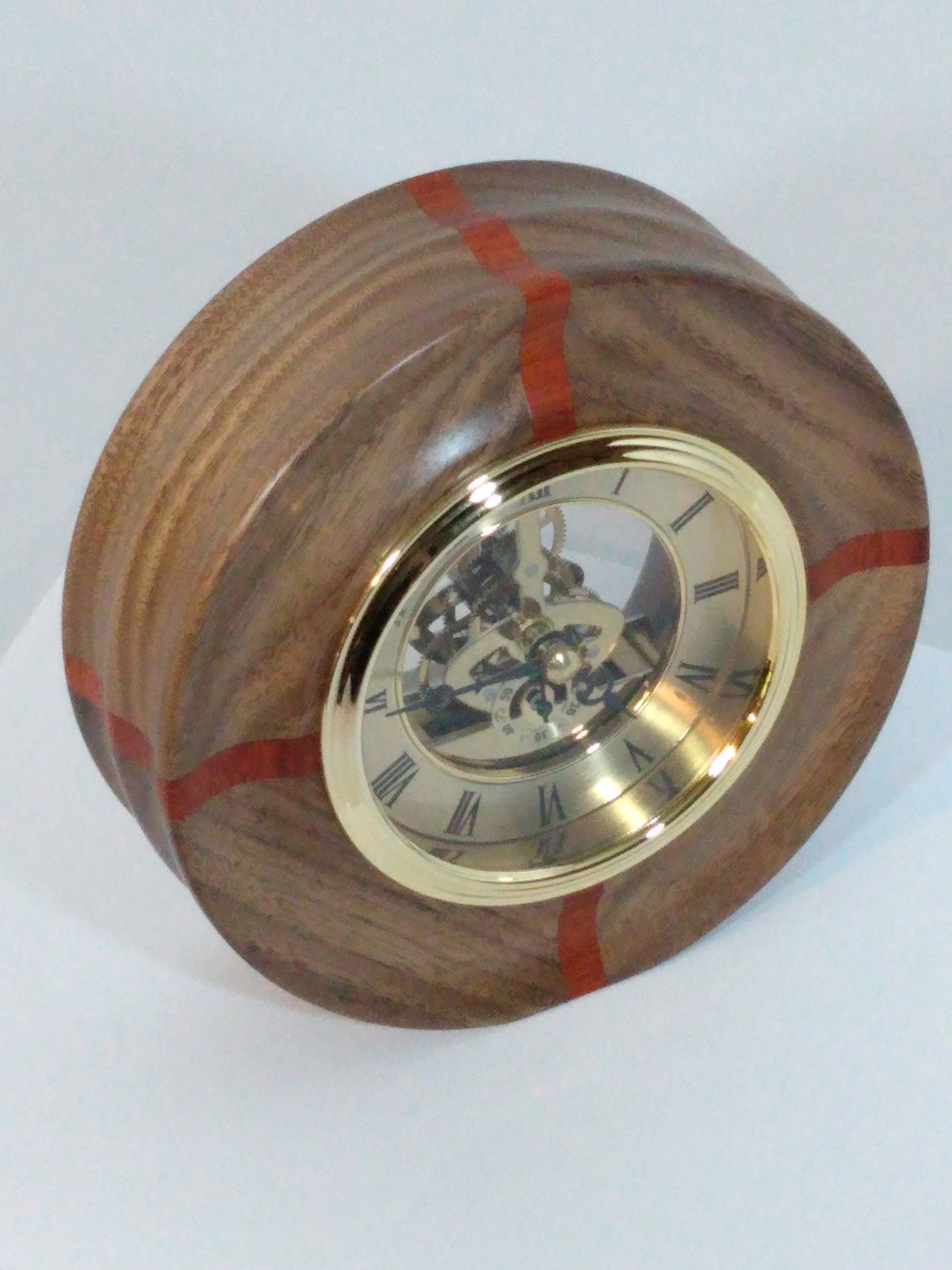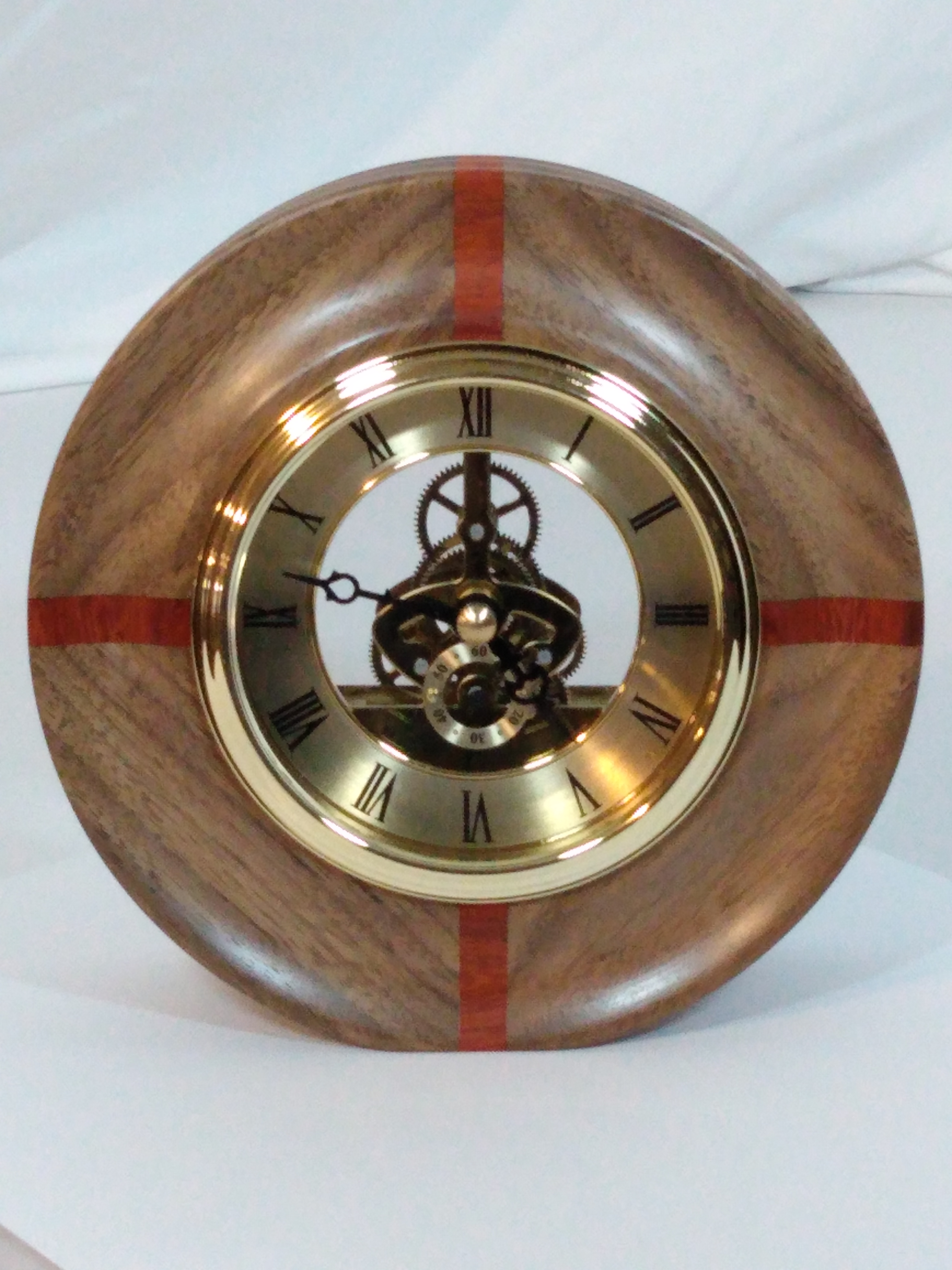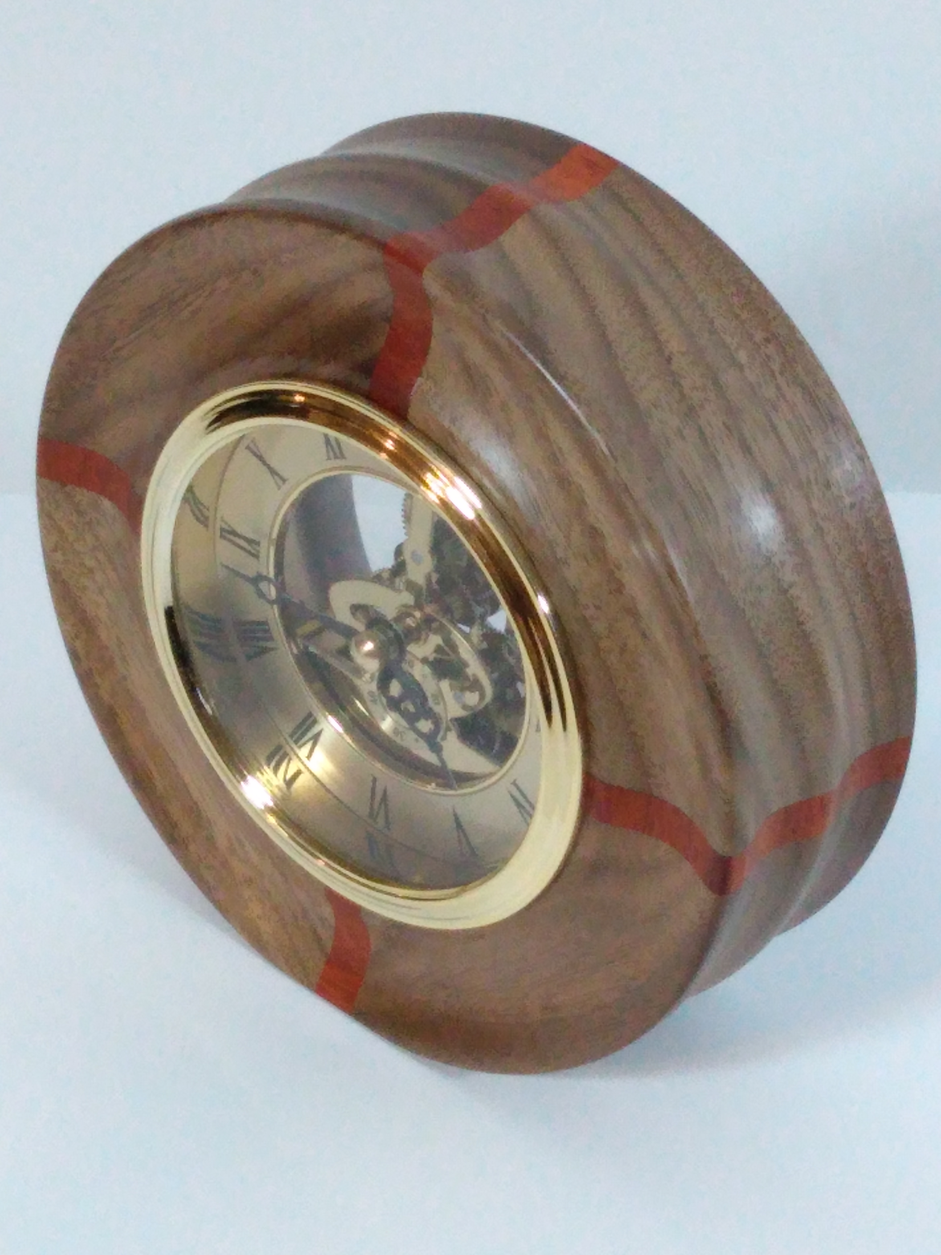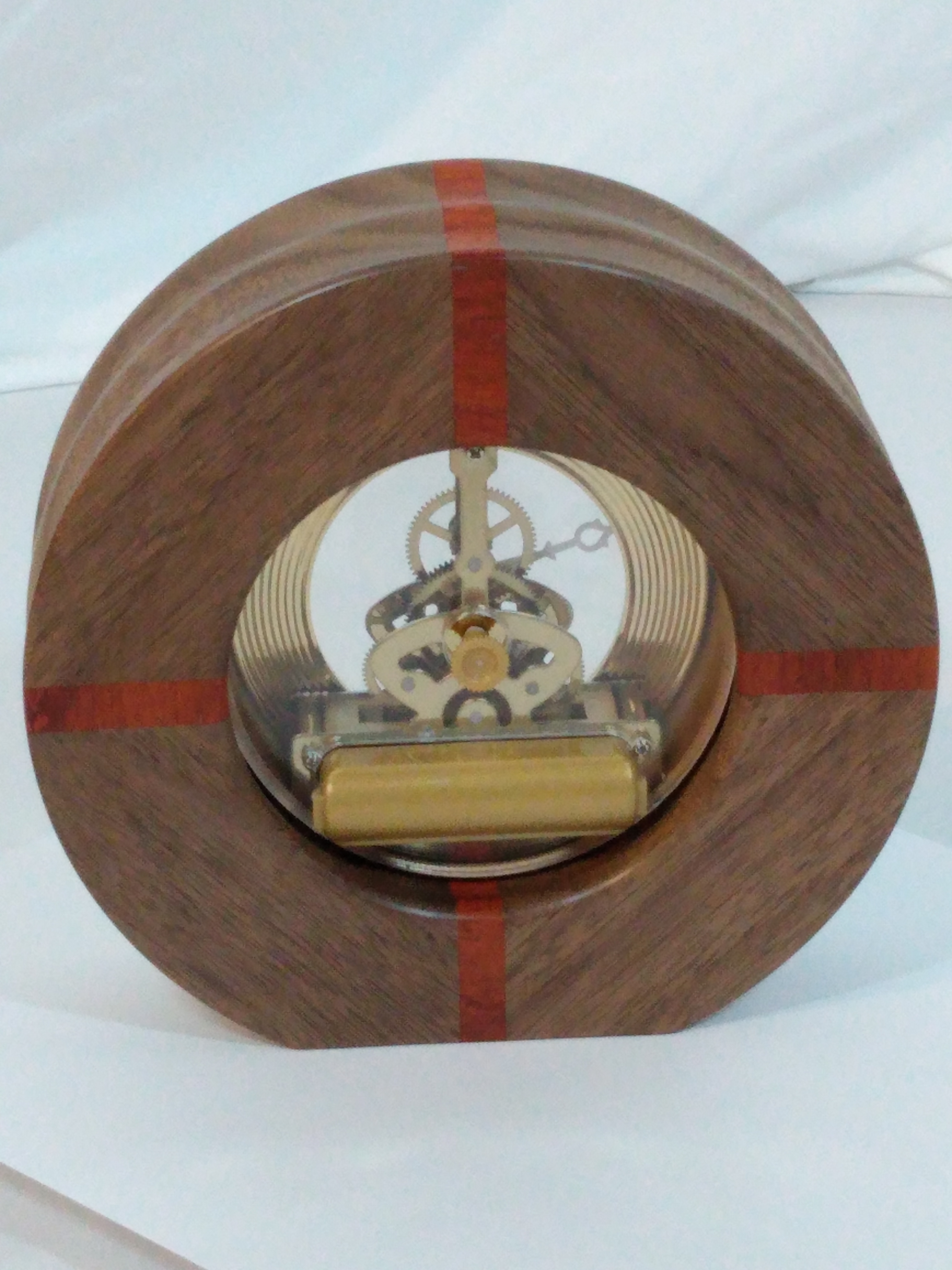 Mantel Clock – Walnut and Padauk circular frame surround this classic skeletal quartz movement clock finished in brass trims, 6″ outside diameter. Powered by 1 AA battery (not included)