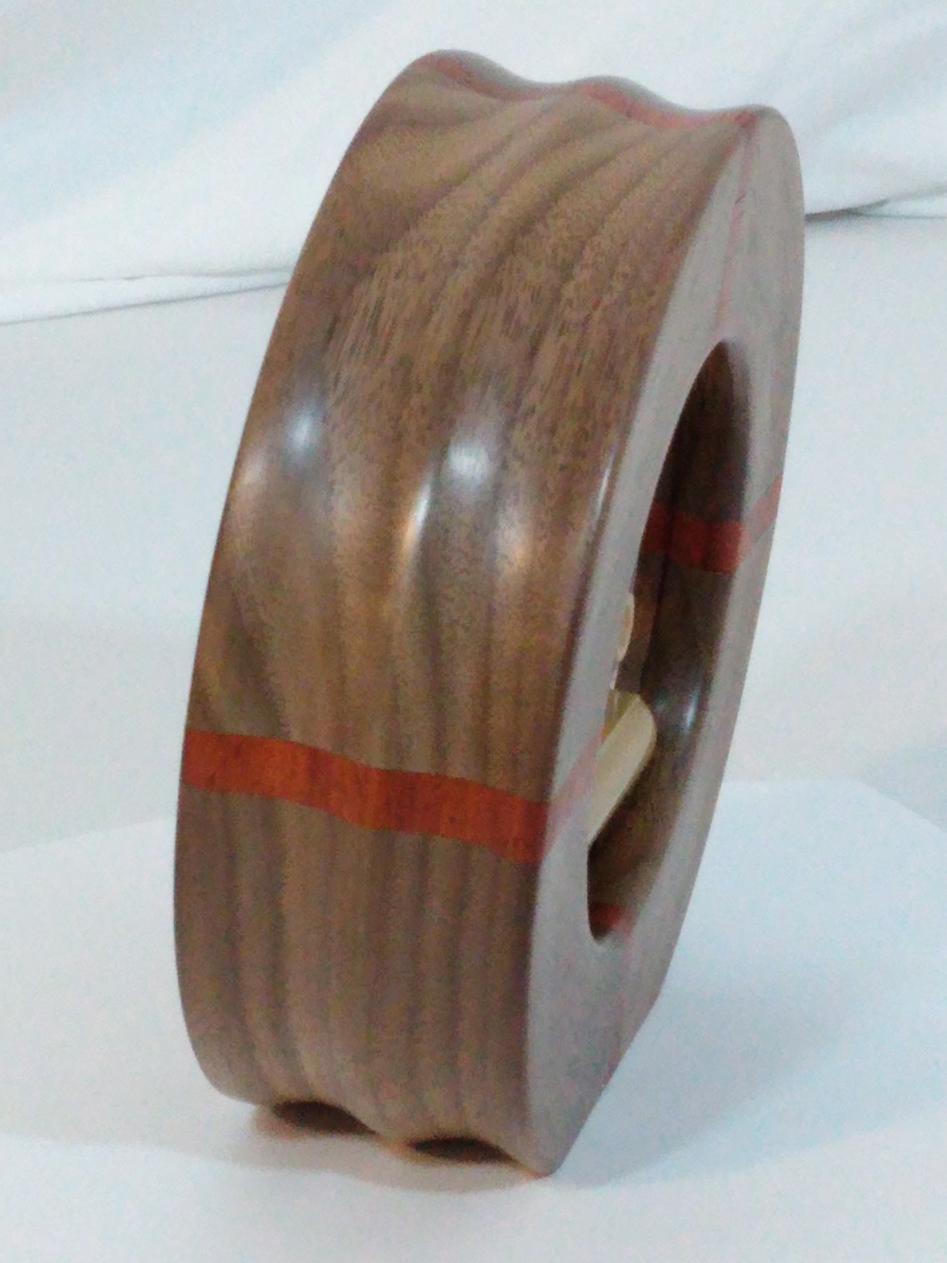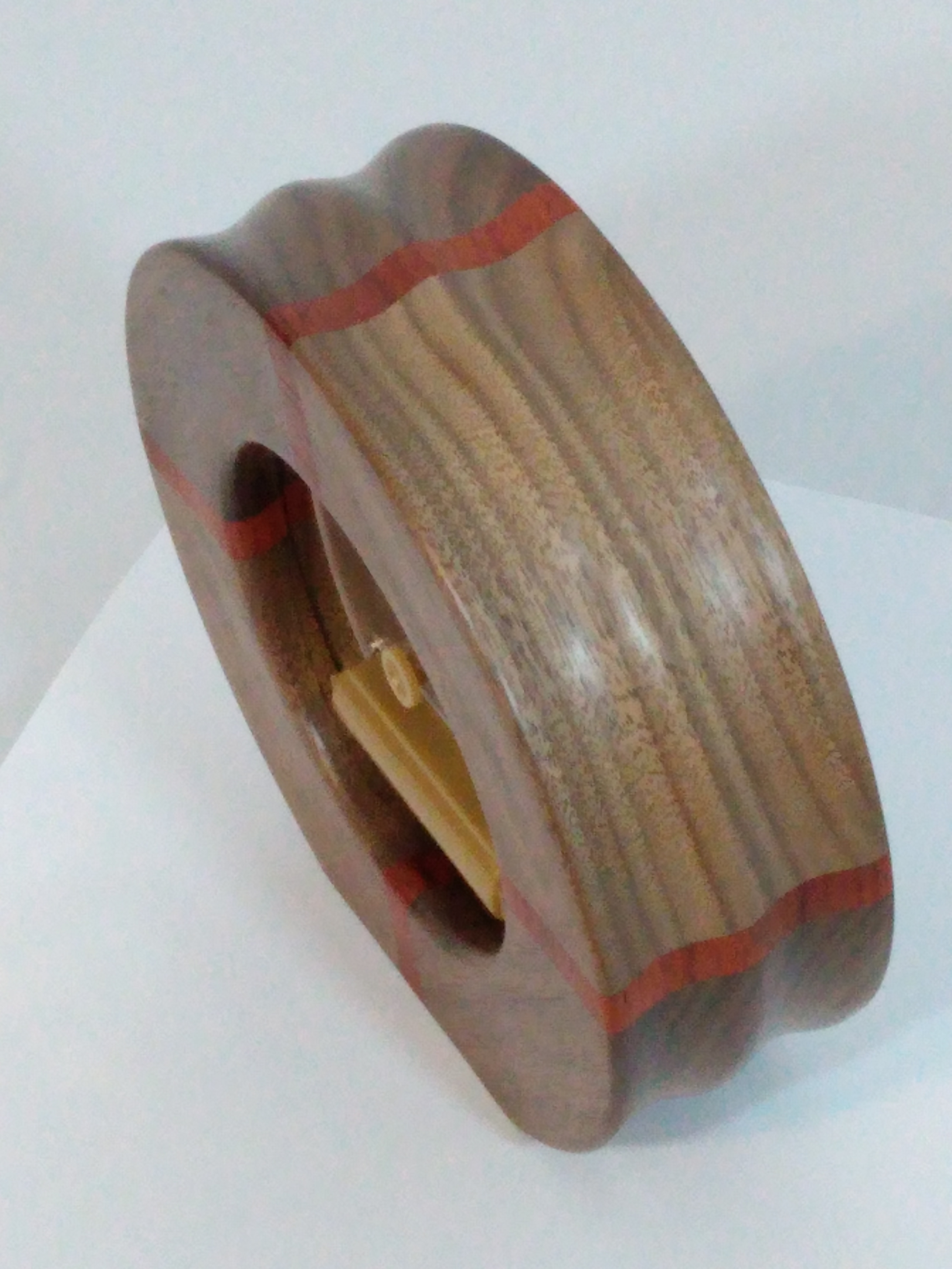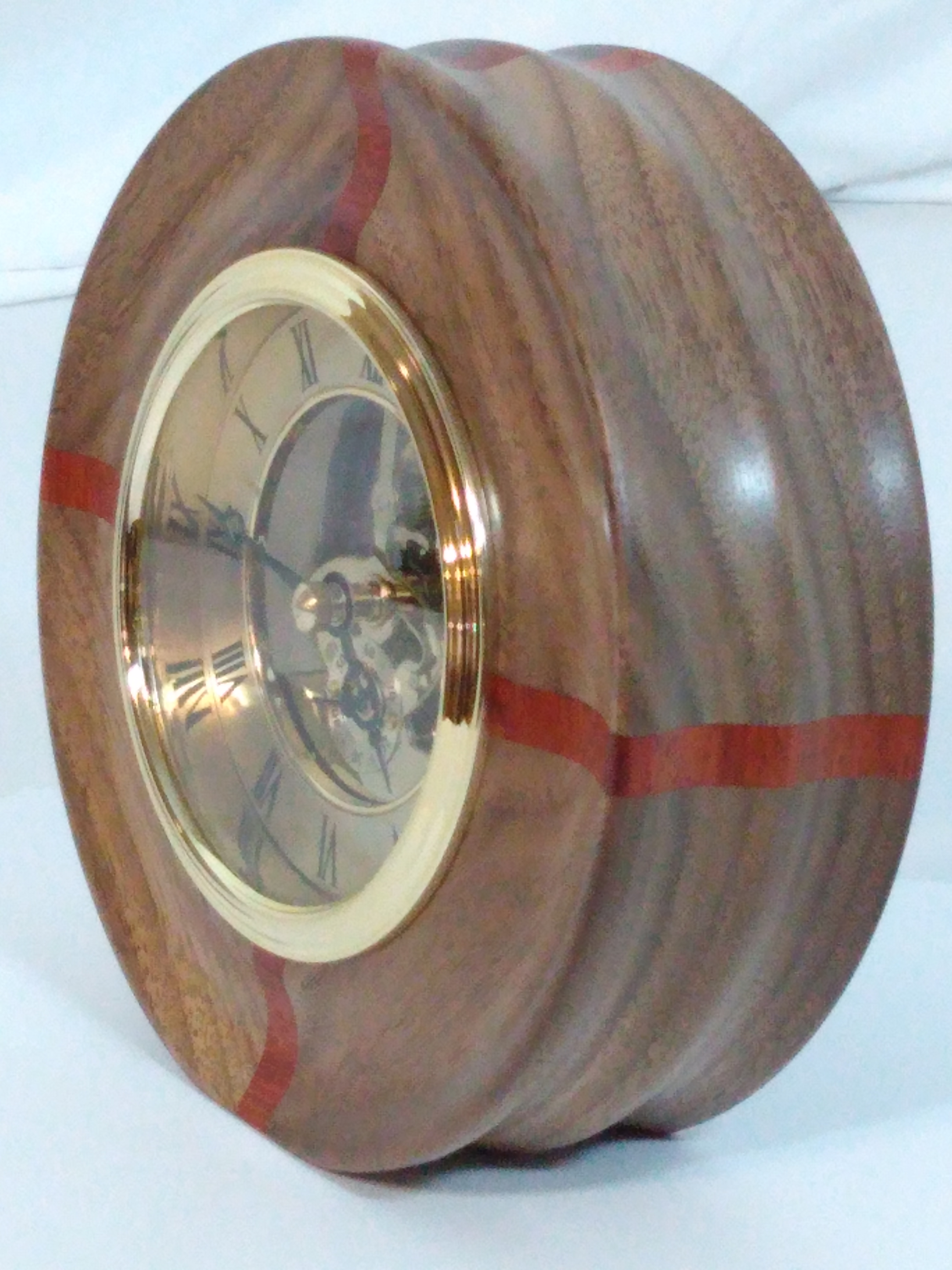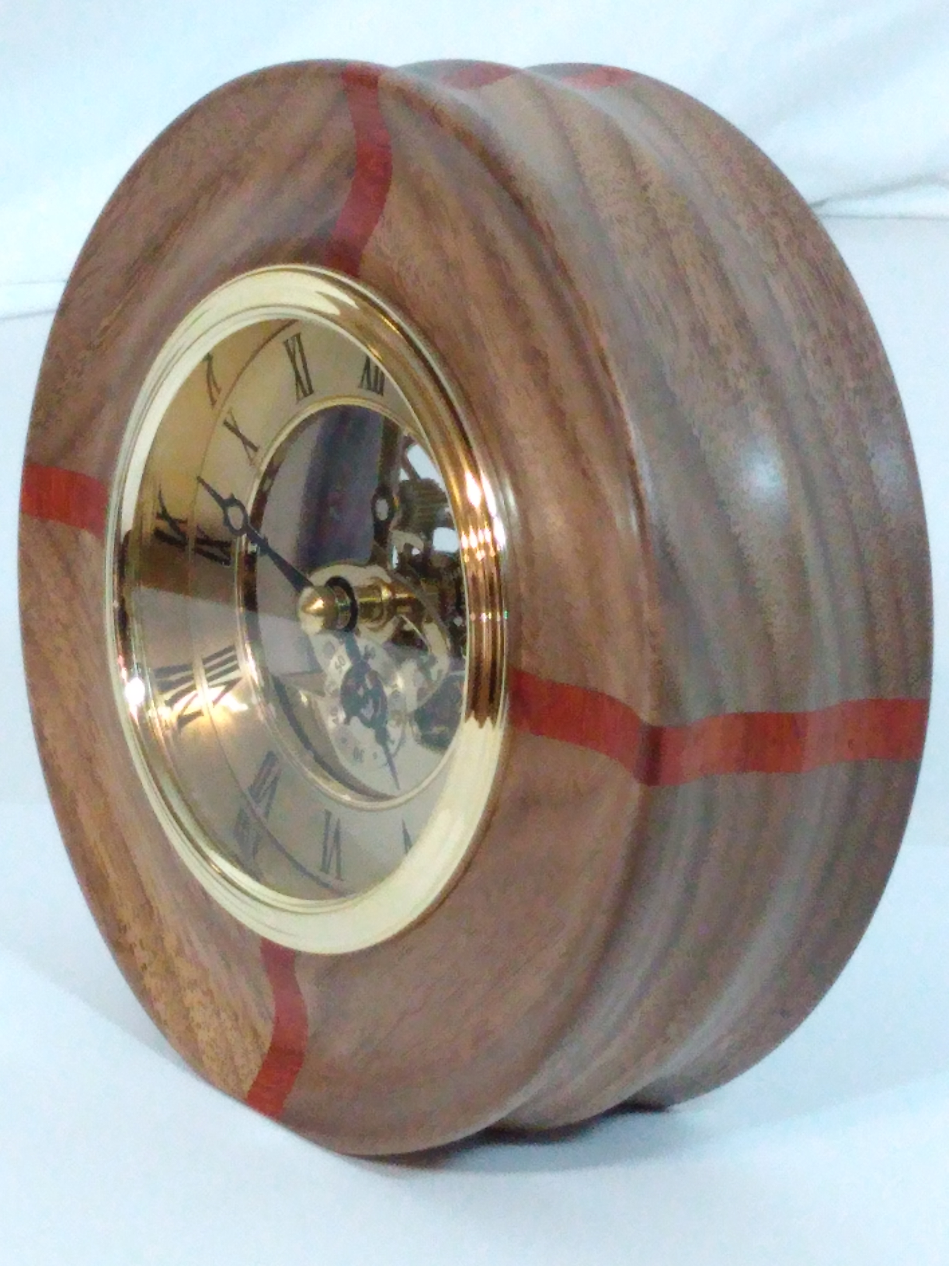 Mantel Clock – Walnut and Padauk circular frame surround this classic skeletal quartz movement clock finished in brass trims, 6″ outside diameter. Powered by 1 AA battery (not included)